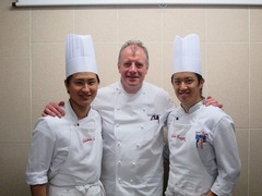 シェフを囲んで、助手を務めた柏原 章広君(左)と磯野 翼君(右)。