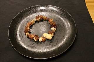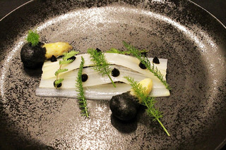 皿に黒いキノワ、炒めたエシャロットのみじん切り、ホワイトアスパラガスのピューレ、黒の練りゴマ、サラダバーネットのみじん切り、山椒を混ぜ合わせたサラダを置き、塩茹でにして、帯状に切って規則正しく並べたホワイトアスパラガスで覆い、黒にんにくのピューレ、ノコギリソウ、サラダバーネットをあしらっています。