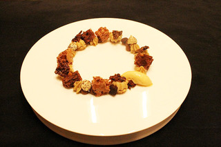 リング状に盛り付けられたさまざまなクリーム、アイス、スポンジケーキ、メレンゲ菓子のそれぞれに、題名にもある3つの素材が使われており、食感、温度、風味の違いが楽しめそうなデザートでした。