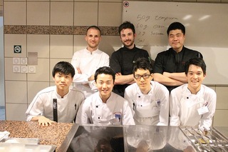 講習のアシスタントを務めたのは、左から、フランス料理研究課程の南村颯太さん、藤本知也さん、矢野智大さん、沖天心さん、研修生のKANG HOSEOKさん(右奥)。