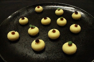 1品目は、コースが始まる前に食前酒とともに提供される小さい料理で、フランス料理ではアミューズ・ブッシュと呼ばれています。カリフラワーのピュレを丸い型に入れ冷凍し、溶かしたカカオバター(注1)にくぐらせ表面をコーティングします。常温ではコーティングに変化はありませんが、口に入れた時に体温で破れ、中のピュレが弾け出ます。上にはタマリンド(注2)というフルーツのピュレと様々なハーブ。