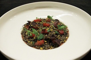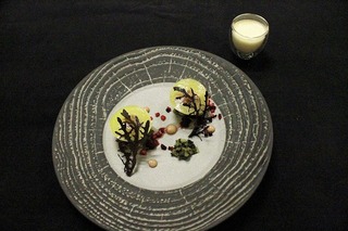 生クリームや卵黄を混ぜたブルーチーズのクリームを皿に注ぎ、ゆっくり火を通してから冷やして置きます。提供時にはクリームをヘーゼルナッツ油でマリネしたレンズ豆で覆い、赤ワインや白バルサミコ酢、はちみつなどを混ぜたマリネ液に浸けたグレープフルーツ、その液体にティム産のこしょうを風味づけに加えたソースを少量注ぎ、ハーブが調和良く盛り付けられています。タイトル通り、多くの仕事が込められた1皿でした。