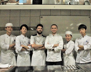 講習のアシスタントを務めたのは、左から、フランス料理研究課程の六車大輝さん、研修生の等々力竜輝さん。クーザン氏、バルト氏を挟んで福岡明さん、幸晃弘さん。
