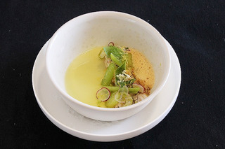 フヌイユの柔らかさと、酸味と甘みのあるにわとこ風味のりんごのジュレ、ベーシックなビスクと、食感のある野菜のピクルスの組み合わせ。