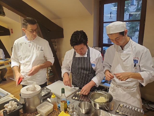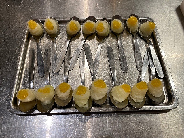 研修生と研究生でアミューズを作成している様子です。慣れた手つきで研究生に教えながら作成していました。最後はシェフに味見をしてもらい、コミュニケーションもとれていました。研修生の成長ぶりが見られる場面でもありました。
