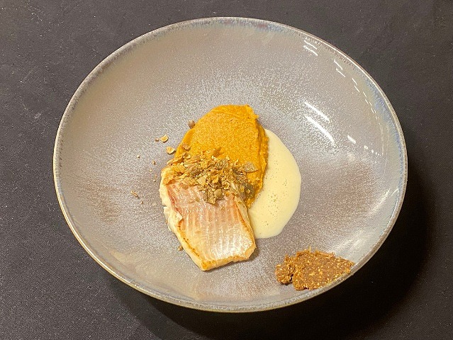 つけ合わせには玉ねぎの薄切り、一口大に切ったかぼちゃ、バターをオーブンでローストして旨味を凝縮させて作ったピューレを添えます。手前にあるペーストは、香ばしくローストしたかぼちゃの種を粗く刻んだもの、かぼちゃの種の油、醤油を混ぜたペーストです。種の香ばしい香りと醤油が合わさり、淡泊な魚の身ととても良い相性でした。