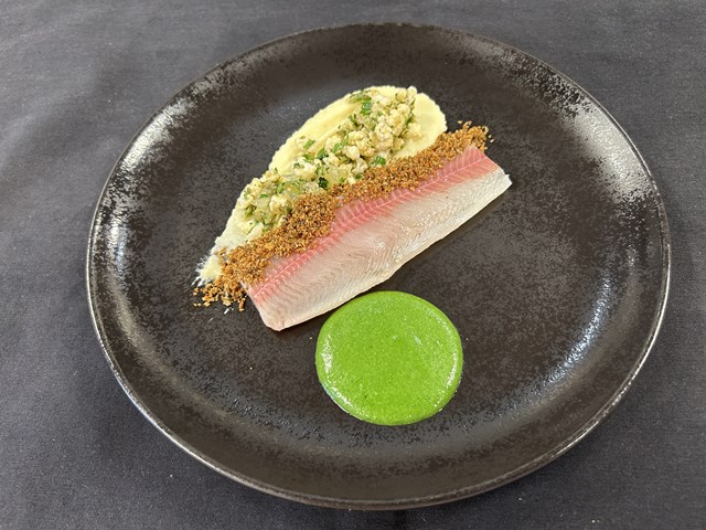 グルノーブル風という名前は、レモン、ケイパー、クルトンなどを使用した料理につけられることがよくあります。今回は小房に分けた生のカリフラワーとレモン、ケイパー、パセリを混ぜ合わせて魚の横に添えました。その他にもカリフラワーのピューレと、焼いた魚の骨と皮を細かく刻んでパン粉と混ぜ合わせとものをふりかけています。こちらは日本人にはどこか馴染みのある味でした。