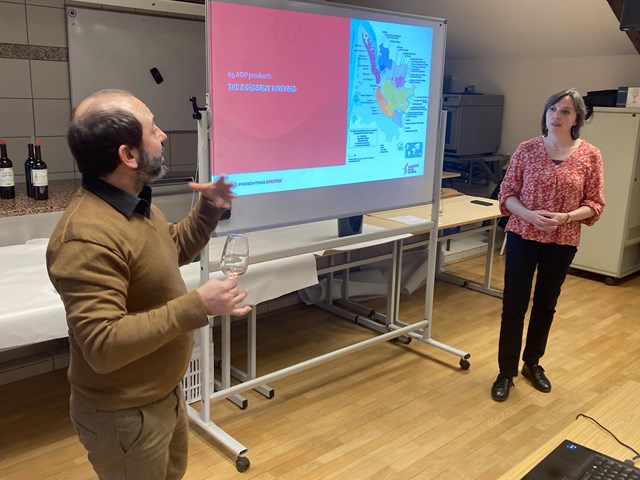 今期最後の専門講習はボルドーワインについてです。今回の講師はリヨン近郊でボルドーワインやローヌエリアのワインについての講習をされているアレクサンドル・コーエン氏です。昔はワインと関わりのない仕事をされていたそうですが、ワインへの情熱が高まりレストラン運営などの仕事を経て現在の仕事をするようになったそうです。レストランでディレクションをしていた時も「ずーっとワインカーヴにいましたね(笑)」とのこと。現在も海外で講師をすることを目指した勉強などを続けている、ワインへのパッションがあふれ出るコーエン氏です。