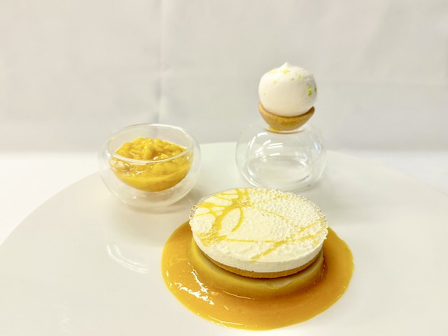 構成は下からCoulis mangue galanga(ガランガとマンゴーのソース)、Soebet au foin(干し草のソルベ)、Cube de citron(角切りレモン)、Pâte sucrée(タルト生地)、Mousse fromage blanc(フロマージュブランのムース)、Confit exotique(エキゾチックなフルーツの粘度があるソース)、Opaline(薄くてぱりぱりする飴)です。横にはMarmelade mangue(角切りマンゴーのソース)と、たっぷりメレンゲが絞られた一口サイズのタルトが添えられています。