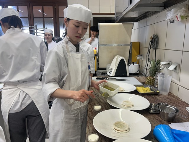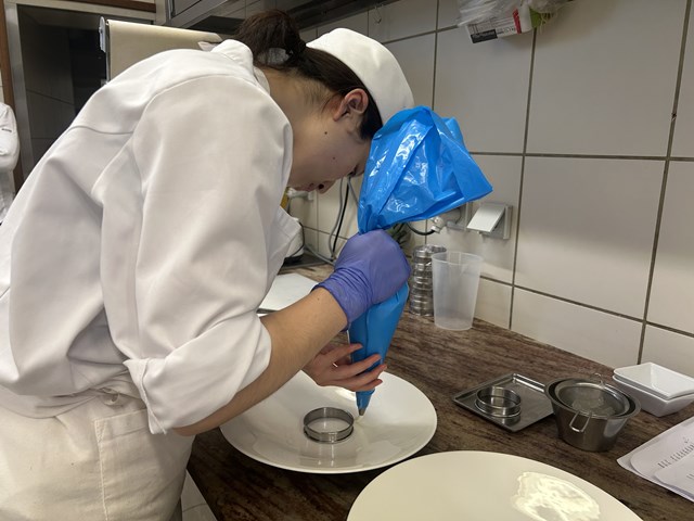 『今回は皿盛りのデザートを教えていただきました。皿盛りのデザートはスピードが求められますが、実際にシェフの動きを見ていると、一切の無駄がなく、洗練された動きであることがよくわかりました。研修先へ行くための予行練習だと捉え臨みましたが、自分から仕事をもらいにいくことや、シェフの動きを見ながら自分にできる仕事を見つけることは、思っていた以上に難しく、戸惑う場面も多くありました。「アシスタント」とは名ばかりで、実際には足手まといになってしまう場面も多く、自分の未熟さを痛感しました。この経験を無駄にせず、研修までの期間、少しでも成長できるよう努めていきたいと思います。』