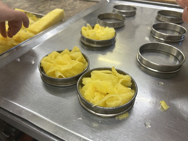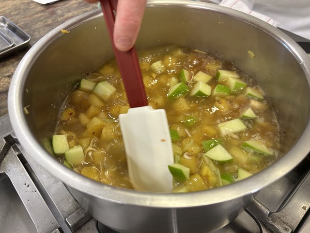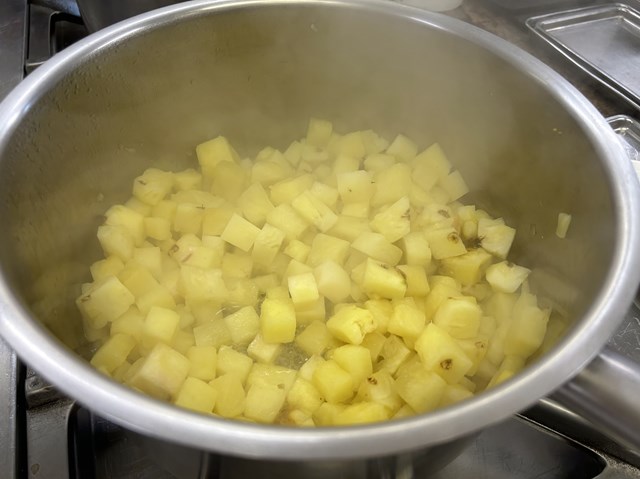 まずはパイナップルをさまざまなパーツに加工していきます。角切りにしたパイナップルを鍋で炒め水分を飛ばし、味を凝縮させたところにグラニースミスという品種のりんごの角切り、レモングラス、水を加え、さらに煮詰めてソースを作っていきます。