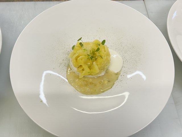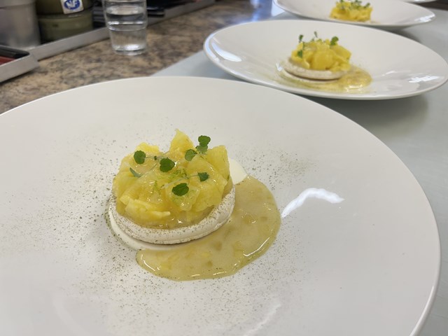 L'ananas victoria, En carpaccio au parfuma d'aloé Véra, fine meringue croustillante, sorbet citronnelle