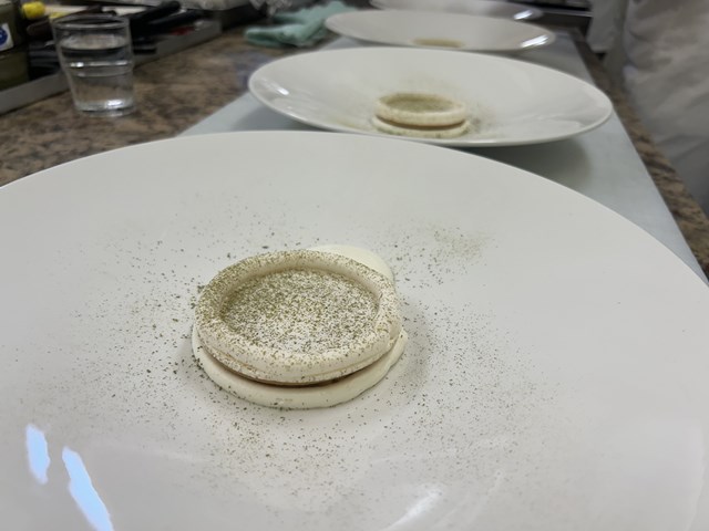 メレンゲにレモンの皮と酸味を加えて甘みを抑えています。アシスタントを務めた研修生もシェフの作業を見ながら同じように絞っていきます!緑色の粉末はもみの木のパウダーです。