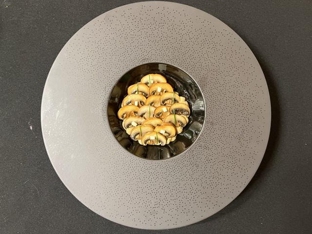 シャンピニョンは厚さ、形が均一になるように切りそろえたものをきれいな焼き色がつくようにソテーします。こちらの皿は現在お世話になっている研修生が仕上げて盛りつけをしてくれました!とてもきれいに仕上がっていますね。