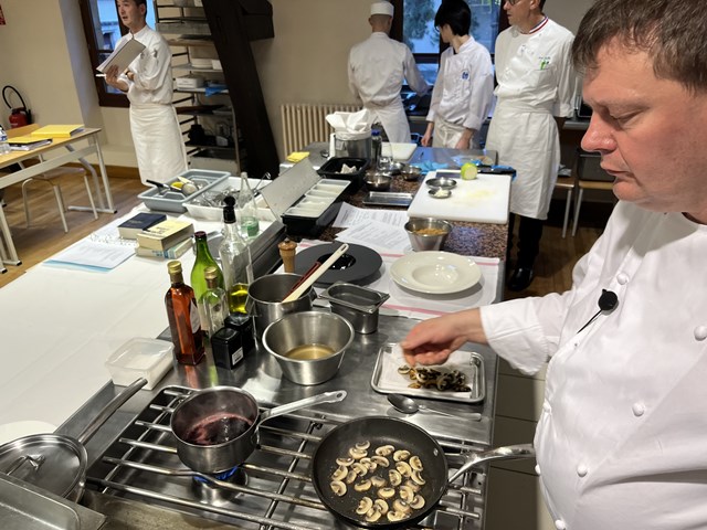 今回の講習では、シャンピニョンを使った前菜と、サンドルという川魚を使ったメインの2品を作成していただきました。