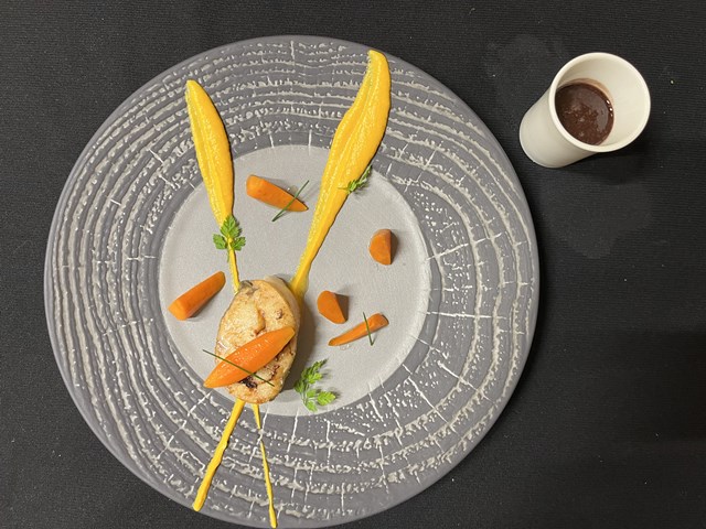 つけ合わせには人参を使用し、生姜の風味を効かせたピュレと、切りそろえた後に真空調理をしてグラッセに仕立てていました。
