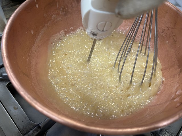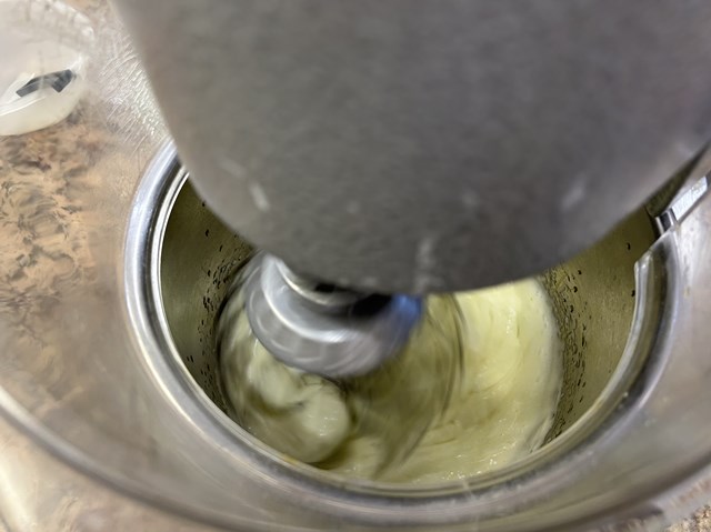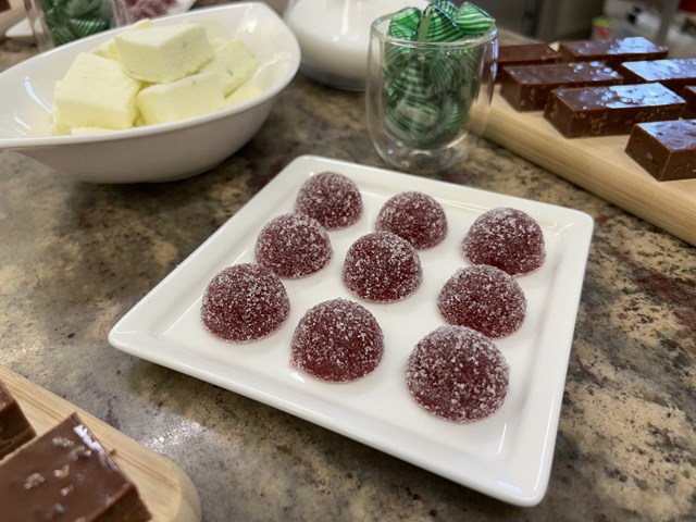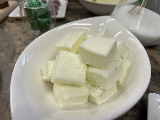 一般的なギモーブは卵白にシロップ、ゼラチンを加え泡立てたメレンゲを使用しますが、サラディノ氏は卵白を使用せず、代わりにトリモリン(転化糖)を使用します。実際に試食させていただくと、口溶けが良く、さらにミントの香りを加えることによってより爽やかな仕上がりになっていました!