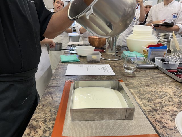 次に、Pâte de fruits framboise rose(パート・ドゥ・フリュイ・フランボワーズ・ロゼ)フランボワーズにバラのエッセンスを加えることで長く香りが続きます。少量で作る際の注意点や、材料を入れ忘れない工夫なども教えていただき、普段の実習で作っているからこそ分かりやすかったです。