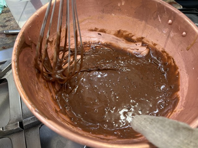 一般的には砂糖でキャラメルを作っていき、生クリームを加え煮詰めていくことが多いですが、最初から生クリームと砂糖を一緒に火にかけていくところが驚きでした。カカオ64%のショコラと食感のアクセントとしてカカオニブ(カカオ豆をローストし砕いたもの)が入っています。