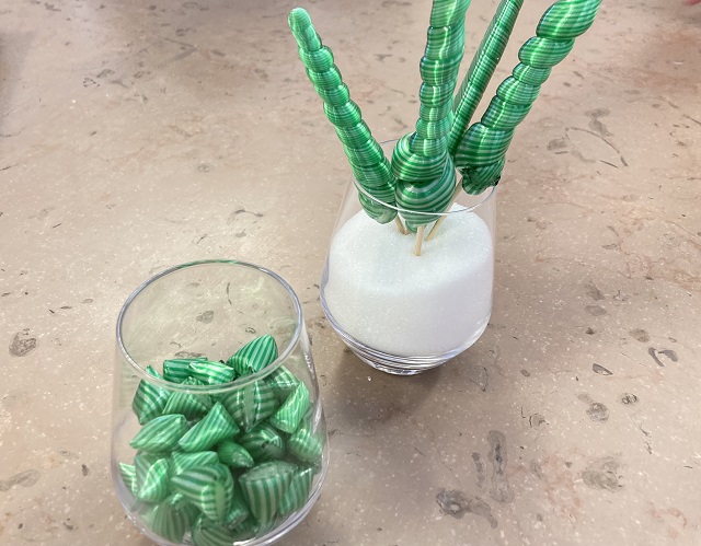 フランスで一般的な飴菓子。今回はミントで風味付けしています。緑色に着色した飴と白い飴を交互に重ねながら伸ばすことで綺麗な層になります。