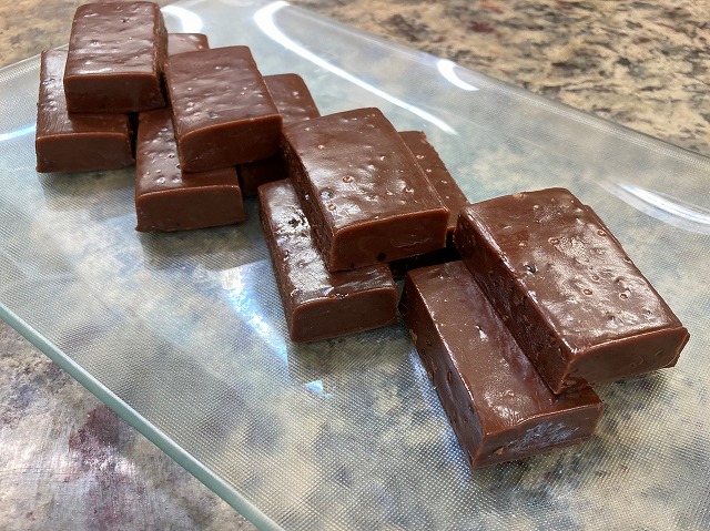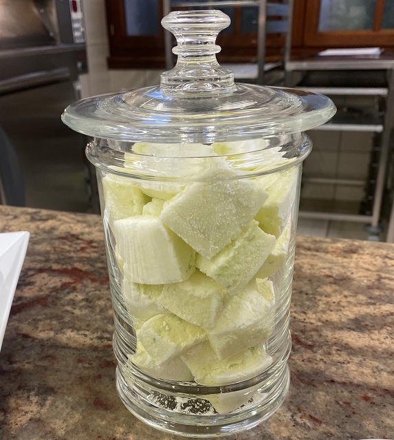 フランスで一般的な飴菓子。今回は香り良く爽やかなミントで風味付けしています。緑色に着色した飴と白い飴を交互に重ねながら伸ばすことで綺麗な層になります。簡単に出来そうでとても難しく、手早く作られていくベルランゴに研究生達は見入るように講習を受けていました。