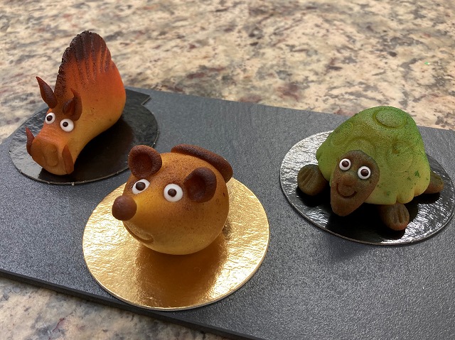 日本ではマジパン細工と呼ばれます。アーモンドと砂糖を主材料として作られたペーストで観賞用ではなく、食用として作られます。こちらはサラディノ氏が得意とされるテクニックの一つで今回はイノシシ・ネズミ・カメの3種類を作っていただきました。