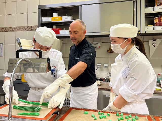 作業工程はとてもシンプルで、また作業スピードも速く、あっという間に製品が仕上がっていきました。助手に入った研究生もフランス語でのコミュニケーションをつりつつ、作成作業をシェフと一緒に行いました。シェフの技術を近くで見ることが出来て、いろいろ発見があったのではないでしょうか。