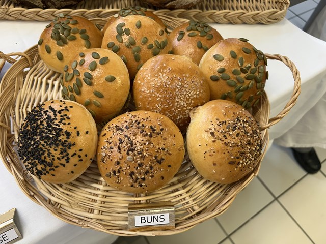 ハンバーガーに使われるパンです。生地には脱脂粉乳やバターが練りこまれていて、焼き上がりも柔らかく、風味が豊かなのが特徴です。ドリュールを塗ったり、トッピングとしてゴマやカボチャの種、ヒマワリの種やソバの実など数種類の穀物が混ざったものを上にかけたりして焼きあげています。