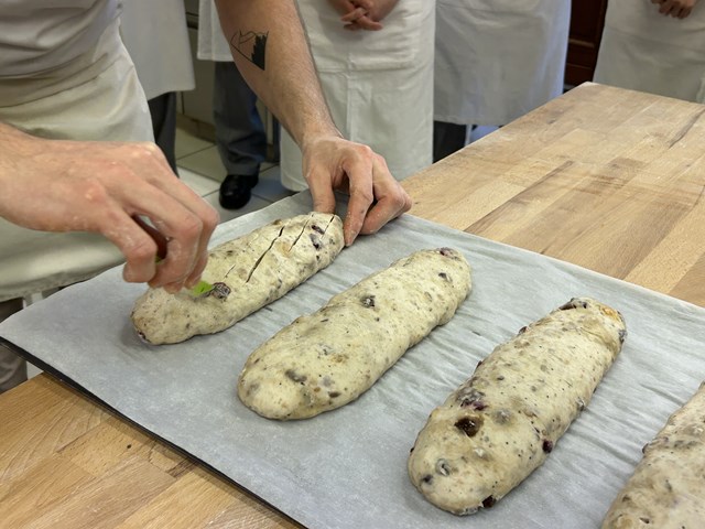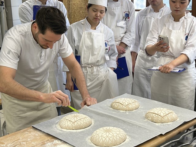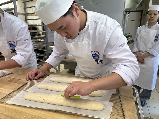 焼く前の生地は非常に柔らかく、扱いが難しいので、成形から表面の切り込みを入れるところまで研究生一人一人に丁寧に指導をしていただきました。バゲットをまっすぐ焼きあげるために表面の切り込みは均等に入れることが大切だとおっしゃっていました。