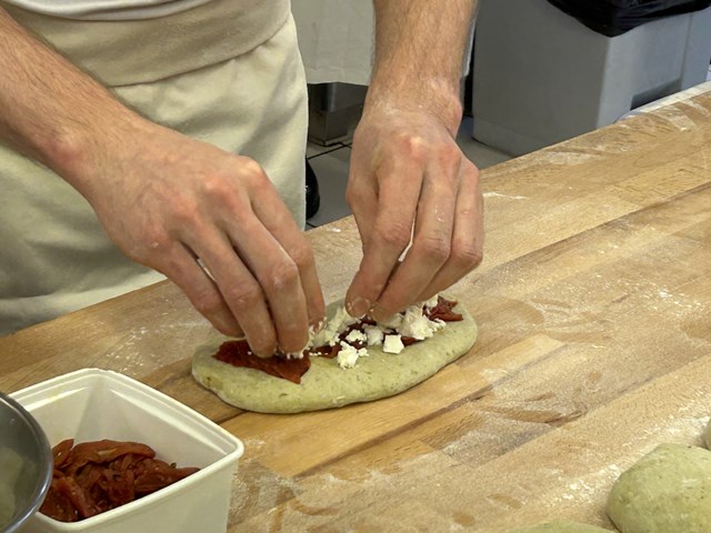 そしてふたつ目は「パン・ペスト」というパンです。生地にバジルソースを粉末状にしたものを練りこみ、中にはドライトマトとフェタチーズを包んだパンを作成しました。