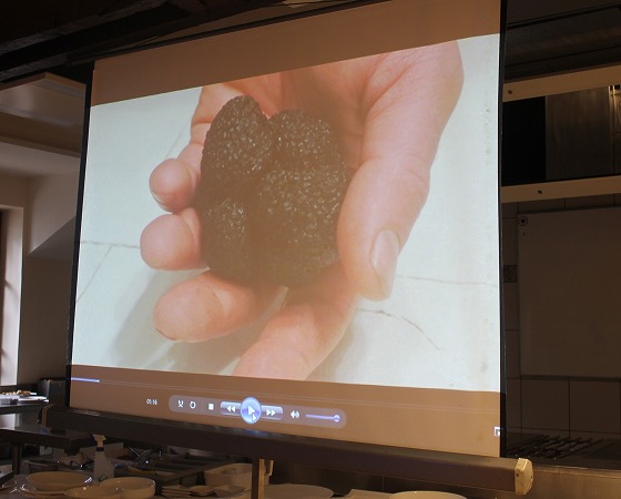 はじめに地図やプロジェクターを使ってトリュフの収穫方法や収穫の時期、人工栽培の方法や適する土壌などについて詳しく説明して頂きました。トリュフの収穫ではブタに犬、ハエを使います。収穫時期は、トリュフの種類によって違いますが、10月から3月まで。自然にできるトリュフは量も少ないので、今から約150年前に発見された人工栽培で生産をしています。年間の収穫量はおよそ150トンで、その9割近くが人工栽培だそうです。トリュフは石灰質で水はけのよい土壌で育つので、フランス南部はトリュフ栽培に適しており、生産地はこちらの地方に集中しています。