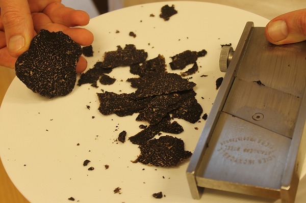 その後は黒トリュフ、秋トリュフ、サマートリュフなど種類の説明と、色や香り、味の違いなどを説明していただきました。トリュフの種類を区別する場合、香りだけでなく、表面の皮と断面の模様で区別します。手に取って実際に見ることが大切であることと、購入をするときには、表面をナイフで削って中の模様を見せてほしいと依頼することも可能だそうです。その後、実際にスライスした黒トリュフの試食をしました。