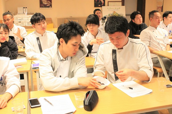 最後にフレッシュ・トリュフの保存方法やイタリアの白トリュフとの違いについての質問がありました。フレッシュ・トリュフは一度に大量に食べるものではないので、余った場合は冷凍保存ができて、環境によりますが1年くらい使用できるそうです。また乾燥したトリュフは、米やタマゴと一緒に密閉容器に入れておくと香りが移り、リゾットやスクランブルエッグにするとよいそうです。フランス産の黒トリュフとイタリア産の白トリュフは日本でも有名です。どちらも高価ですが、黒トリュフが1キロあたり1000ユーロなのに対して、白トリュフは3000ユーロするそうです。本日の講師のボワシュー氏は、「トリュフは高いというイメージがありますが、料理で使われる量はとても少なく、手が届かないものではありません」とおっしゃっていました。