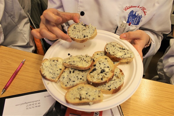 さらにトリュフを使った加工品として、トリュフ塩やトリュフバターなども紹介して頂き、そのバターをたっぷりと塗ったタルティーヌも試食しました。トリュフは油脂成分と相性がよく、バターや油などに香りを移すことが可能です。その特性を生かしてトリュフバターや油が作られています。
