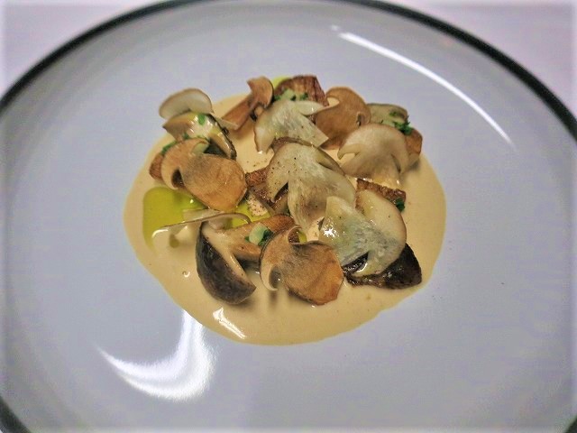 ⑤ グラス:牛乳に炒めたセップ、卵黄、転化糖(糖分の一)、シェリー酒酢、塩、生クリームを加え85℃まで加熱する。アイスクリーマーにかける。