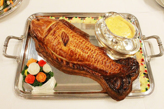 すずきのパイ包み焼き。魚と生クリームがたっぷり入った贅沢なムースをスズキの腹に絞り入れ、パイ生地で包み焼きした料理。ソースは卵黄と澄ましバター、香草と白ワイン酢を煮詰めたものを加えたベアルネーズ・ソースにトマトを足します。すると「ソース・ショロン」と名前が変わります。