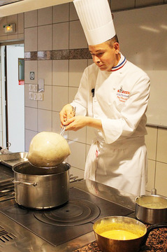 今回の講習は、リヨンの3つ星レストラン「ポール・ボキューズ」から、ジル・レナルト氏にお越しいただきました。ポール・ボキューズ氏は今年の1月にお亡くなりになられましたが、今年度のミシュランガイドブックでも3つ星を取り、1965年から53年間3つ星を維持しています。