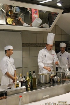研究生は既に日本の講習でこの料理を見たことはありますが、本家本元のみごとな作業を目の当たりにして、ノートを取るのも忘れて見入っていました。ムースやソースの話を研究生と対話しながら、レナルト氏は手早く作り上げていきました。