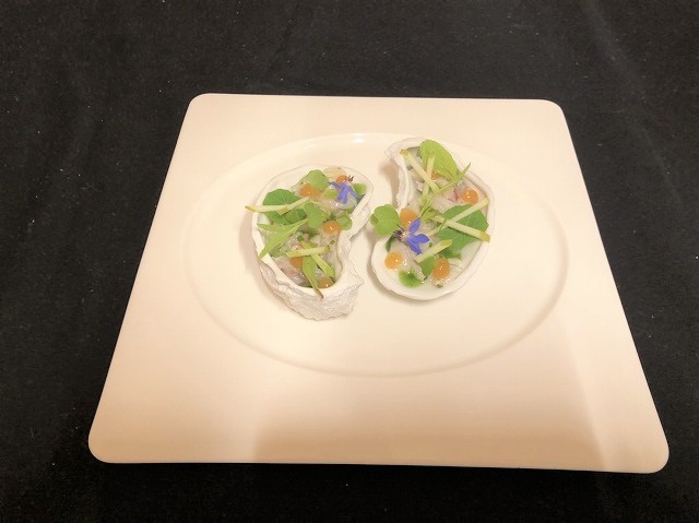 1品目は牡蠣と帆立を使った冷たい前菜です。牡蠣は殻から身を外してしゃぶしゃぶのようにさっと火を通し、帆立とバールというスズキ科の白身魚を細長い棒状に切ってエシャロットのみじん切り、シブレットのみじん切り、レモン汁、カラマンシーという柑橘類の酢、ヘーゼルナッツオイルを混ぜ合わせたタルタル仕立てにします。タルタルの上にはりんごの細切り、レモンのジュレ、ハーブオイル、マイクロハーブ、花を散らしています。牡蠣の殻をしたお皿に盛りつけられ一目見ただけで牡蠣を感じさせる1品です。