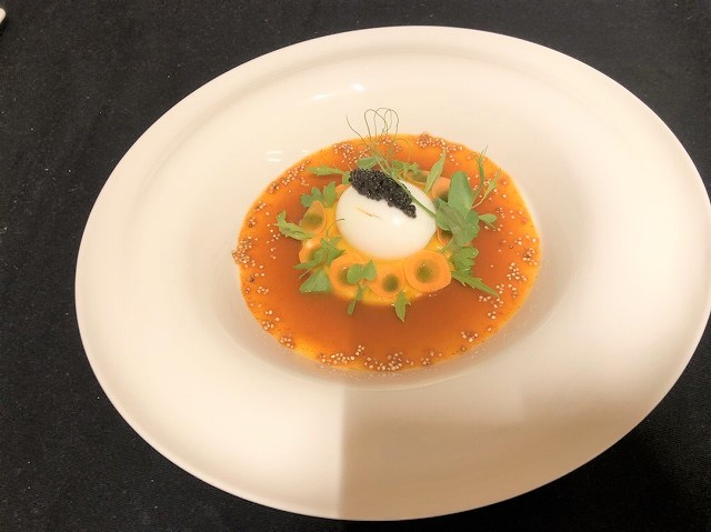 2品目は人参のバリエーションを変えて作成した料理です。真ん中の人参のピューレの上に半熟卵、キャビアを置き、輪切りにスライスした人参のピクルスをラッパ状に巻いて盛り付け、ラッパ上の中に香草で作成した緑の香草風味の油を飾ります。下のソースは人参の果汁にレモングラス、生姜の搾り汁を加えて煮詰め、バターを加えて仕上げています。人参が1皿に3種類に形を変えて料理に仕上げられており、様々な調理方法で一つの食材を生かすことをフランス料理の調理法でデクリネゾンといいます。