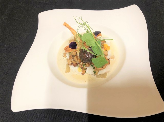 3品目はひらめとごぼうを使った料理です。ひらめの上身は塩、こしょう、ヘーゼルナッツオイルをまぶしコンベクションオーブンの蒸気モードで火を通しふっくら仕上げます。ごぼうは皮を剥き棒状に切り、バターで玉ねぎのみじん切りをしんなり炒め、白ワインを加えアルコール分をとばし、ごぼう、鶏のだし汁を加えごぼうに味を含ませるように煮込みます。ソースにはエシャロットのみじん切りをバターでしんなり炒め、ヴァン・ジョーヌというスイスとの国境に隣接するジュラ地方の生産されている濃い黄色みを帯びた白ワイン、鶏のだし汁を加えて煮詰め仕上げにバターを加えた白ワインソースです。飾りにファアグラ、セップ茸、食パンの小さな角切りを香ばしく炒め、仕上げにピーカンナッツ、シブレットのみじん切りを加えたものと薄切りにして油で揚げたごぼうチップスを添えています。こちらのメニューはフランス校の授業にも取り入れられている料理です。。