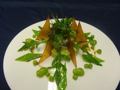 下の緑の部分はアボカド、レモン汁、生クリーム、を混ぜたアボカドのムース。上にカニの身、バジリコの葉、ヴィネグレットを和えたものをのせてあります。周りにはじゃがいもを薄くスライスし三角形に切ってチップスにし刺してあります。サラダを盛り、周りには火を通したえんどう豆と絹さやを散らししています。ソースはミントの香る羊のチーズがベースのクリームと、バルサミコ酢で作ったドレッシングです。![]()