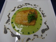 湖などに生息するフェラというマス科の魚の1品です。フィレに卸したフェラに細かく切ったカダイフをつけて表面をパリッと焼き上げています。八角風味のグリンピースのピュレを加えた白ワインソースとキャビアを加えた牡蠣風味の白ワインソースの2種のソースを添えています。