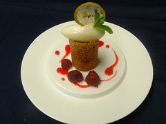 オレンジの風味のテュイルを筒状にして中にはバニラ風味のクッキー、レモンクリーム、フランボワーズが入っています。上にはレモンのシャーベットと、レモンをシロップ漬けにしたチップ。周りにはフランボワーズのソースでデザインしています。![]()