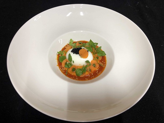 皿の中央に人参のピューレを敷き、半熟卵を乗せその上にキャビアを飾ります。