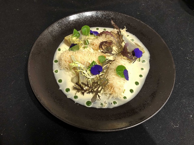 85℃で蒸して火を通した平目を盛り、その上にホタテ貝と牡蠣のタルタルを乗せ、香草のサラダ、えのき茸、花を飾ります。周りにたっぷりとソースを流して完成です。