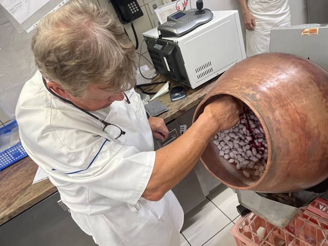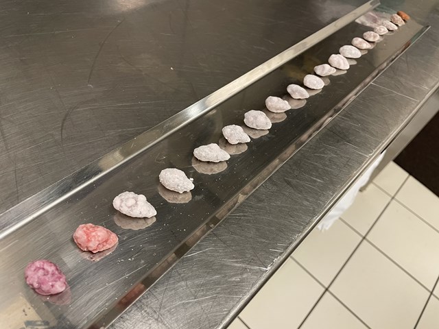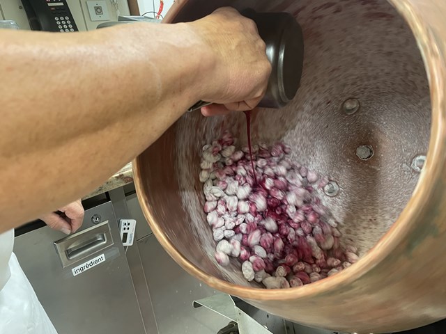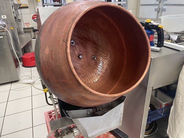リヨンの銘菓であるPralines rougesプラリンヌ・ルージュ。研究生も食べたことはありますが、ヴィオレ氏に持参していただいた「アマンディーヌ」という機械を使用しての作成は初めて見ます。