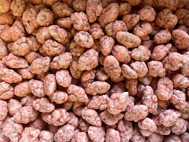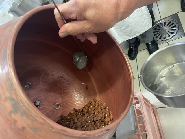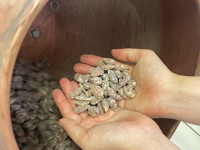 煮詰めたシロップを少しずつ加え、アーモンドの周りに糖衣掛けする作業を繰り返し行います。