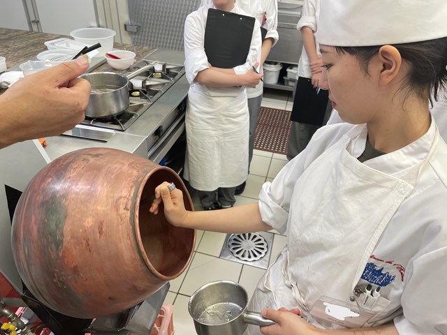 「今回が最後の外来講習アシスタントだったので、今まで以上にシェフの声に耳を傾けて作業するという事を心掛けました。大きな機械を使ってひたすらアーモンドをシロップでコーティングしていくという作業を行い、コンフィズリーは時間も手間もかかるものばかりだったので、普段では絶対に体験できないような貴重な経験をする事ができました。そして何より、シェフとのコミュニケーションがどれだけ大切かを実感することが出来ました。スタージュに行ってもフランス語でのコミュニケーションは必須なので、まずは話そうとする気持ちを大事にして、仕事に励もうと思います。」