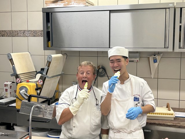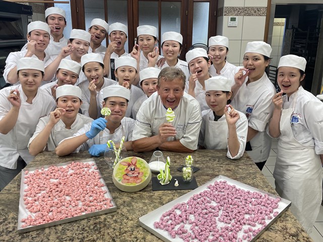 「今回で2回目のアシスタントですが、M.O.F.パティシエの中でもベテランという事もあり、緊張して挑みました。ですが実際に会うと陽気で穏やかな方で、すぐに緊張が解けて楽しいアシスタントが出来ました。隣でお手本を見て飴を形作り、マジパンの上に絵を描いているのを間近で見る事が出来、すごく貴重な経験でした。リクエストを受けてすぐに手際よく絵を描いている姿はとてもかっこよくて、まさに匠の技でした。」